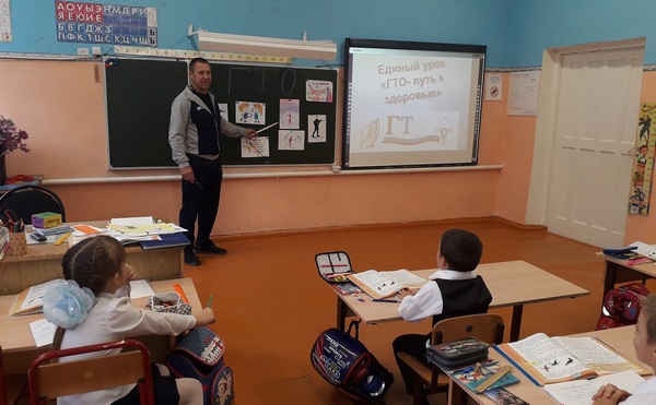 Сегодня учитель физической культуры Дубовой В.И. провел Единый урок ГТО "ГТО - путь к здоровью" для учащихся 1-4 классов. С помощью учителя ребята расшифровали аббревиатуру ГТО и узнали историю развития комплекса ГТО, познакомились с основными видами испытаний и нормативов для I ступени учащихся. Урок у всех ребят вызвал желание заниматься спортом и получить золотой значок ГТО, .