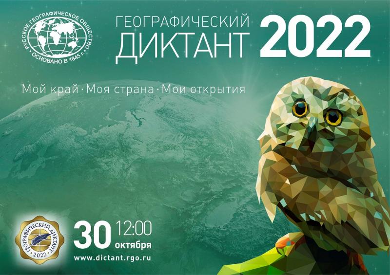 30 октября в 12:00 Русское географическое общество проведёт VIII Географический диктант. В 2022 году масштабная просветительская акция РГО охватит все континенты. Её слоган: "Мой край. Моя страна. Мои открытия".